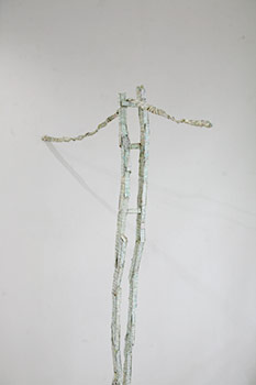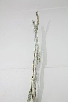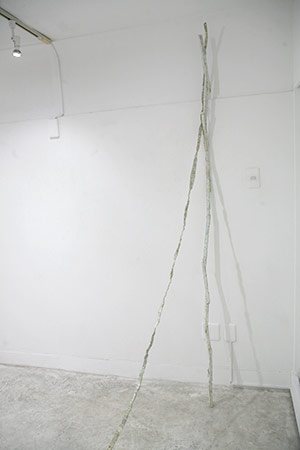 前回、前々回と同じスタイルの、彩色シナベニヤが貼られたスティック状の作品によるインスタレーションをメインにした展示です。