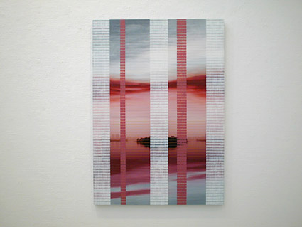 上の作品の拡大した部分です。 画面を横切る等間隔の細い線は、表面に張られた糸です。 白い帯は、白い帯以外の部分をマスキングしてペイントされています。 表面を強調する領域です。 画面を注意してみると、微かに中央に四角に区切られた部分があります。 この部分は描画ではなく、デジタルプリントです。 今回の展示の新しい試みです。 |