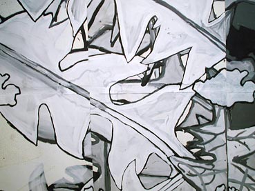 クローズアップされた植物と漂う雲。 作品の支持体が壁紙なのは、伊藤さんが壁に描くことにこだわった為です。 矩形のキャンバスではなく、壁に描く。 壁はキャンバスと違って、移動することができません。 風景が固有に存在しているように、壁も固有に存在しています。 伊藤さんは、藍画廊の壁に石神井公園周辺の風景を描きたかった、と想像します。 |