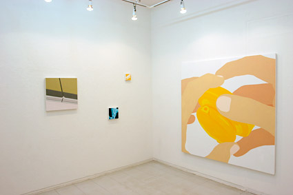 正面壁面の「シャワーカーテンフック」です。 一番小さな作品で、このサイズも内田さんが好んで描く大きさです。 三色だけのシンプルな描写ですが、展示のアクセントになっていて、存在感のある作品です。 |