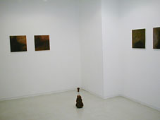 高馬浩展は立体四点、平面四点、計八点で構成されています。 立体は床置、平面は壁面に展示されています。 前回と同じく、一点一点が独立していながら会場空間に統一感を感じさせる展示です。 立体は桂、平面はキャンバスに油彩です。 平面は四点共、45×45cm。 立体は左の作品が一番大きく、50×30×19cm。 全体に小振りな作品と言えます。 立体の手法は独特です。 木をグラインダーで刻むと摩擦熱で燃え、それが黒くペインティングした様に跡を作ります。 つまり、グラインダーのペインティングです。 |