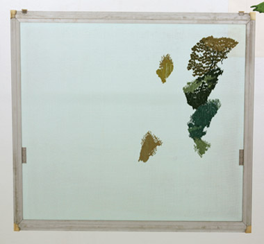 この作品は壁面に直接展示されていますが、その他の網戸の作品はすべて天井からテグスで吊るされています。