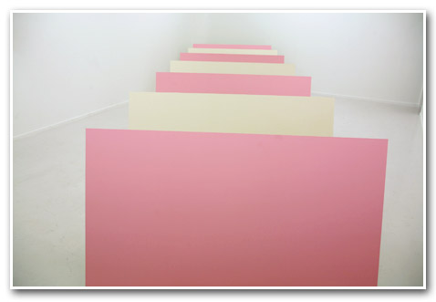 床中央の作品は、タイトル「interview」でサイズ可変、木・水性塗料を使用しています。