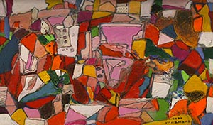 長年、街を描いてきたが最初はモザイク風に抽象化された街並みに複雑な形を捉えて増殖した色で空間を埋め尽くしていた。