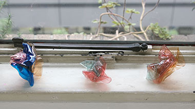 左の3点のマテリアルはすべてプラスチックで、サイズは左から8.5×7.5×9cm、6.5×6.5×7cm、7×9×8cmです。