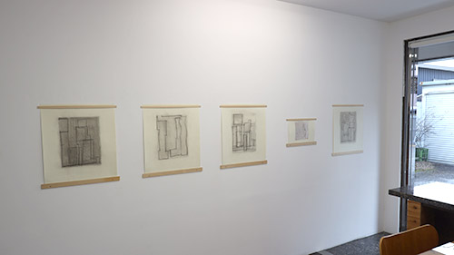 (その他にアクリルガッシュを使用した色彩作品もありますが、基本的な成り立ちはモノクロームのドローイングと同じです。)線は紙(ワトソン紙)の上に幾つかのカタチを描いています。