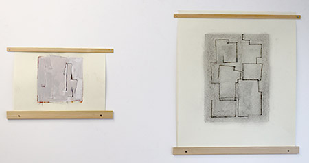 左はマテリアル(アクリルガッシュ、木炭、紙)で542×465mm、右はマテリアル(アクリルガッシュ、木炭、紙)で251×343mmです。